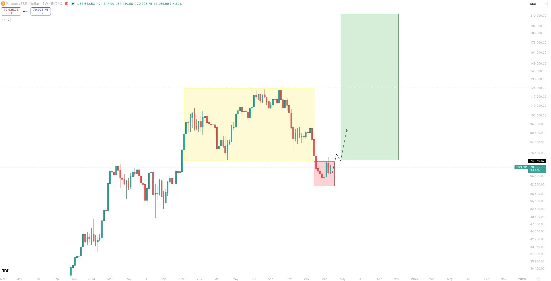 An analyst known as Sykodelic said that in order for bitcoin BTC $71,377.18 Mezo Wrapped BTC 1.16% Market capitalization $42.1 million VOL. 24 hours $1.51 billion to start a large-scale breakout to the $ 200,000 area, it needs to close the weekly candle above $ 74,400. In his opinion, this will confirm the key level of the older timeframe as a rejection and trigger an extended reversal based on the wave plane model. The expert called the upcoming movement «hated» because most of the market does not expect such a scenario, relying on traditional four-year cycles.