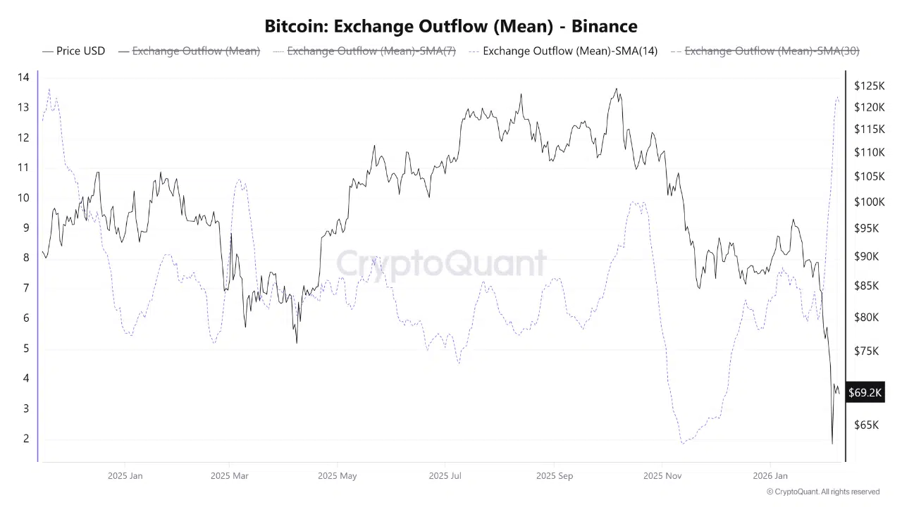 According to the data, the 14-day simple moving average of the Binance Exchange Outflow (Mean) indicator has increased significantly in a short time. While on January 28, the average volume of one withdrawal was about 6 BTC, on February 8, it reached about 13.3 BTC — the highest level since November 2024.