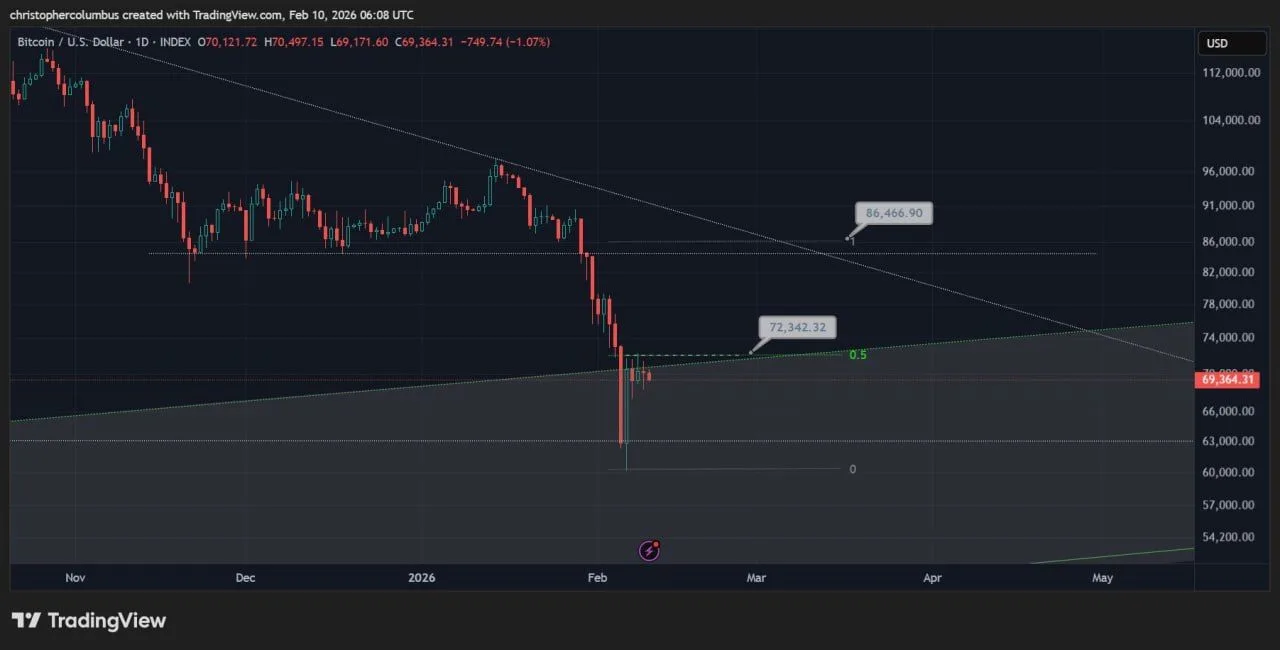 On the daily chart published by analyst Dave the Wave, Bitcoin continued to decline after an unsuccessful attempt to gain a foothold above the downtrend line. The price dropped to around $ 69,364 and was moving towards the lower support zone. Prior to that, the asset broke through the horizontal level in the mid-$ 80,000s and formed a sequence of lower highs and lows, which confirms the short-term downtrend.