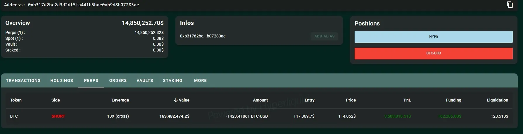 A discussion about possible insider interference has reignited in the crypto market. This happened after an unknown trader, who previously earned $ 192 million on short positions, opened a new large-scale short on Bitcoin BTC $114,192.00 Mezo Wrapped BTC 2.36% Market capitalization $39.26 million VOL. 24 hours $3.93 billion . According to Cointelegraph, the address 0xb317 on the decentralized exchange Hyperliquid opened a new short position of $ 163 million with a leverage of 10x. Currently, the deal is in profit of about $ 3.5 million, but will be liquidated if the BTC rate rises to $ 125,500.