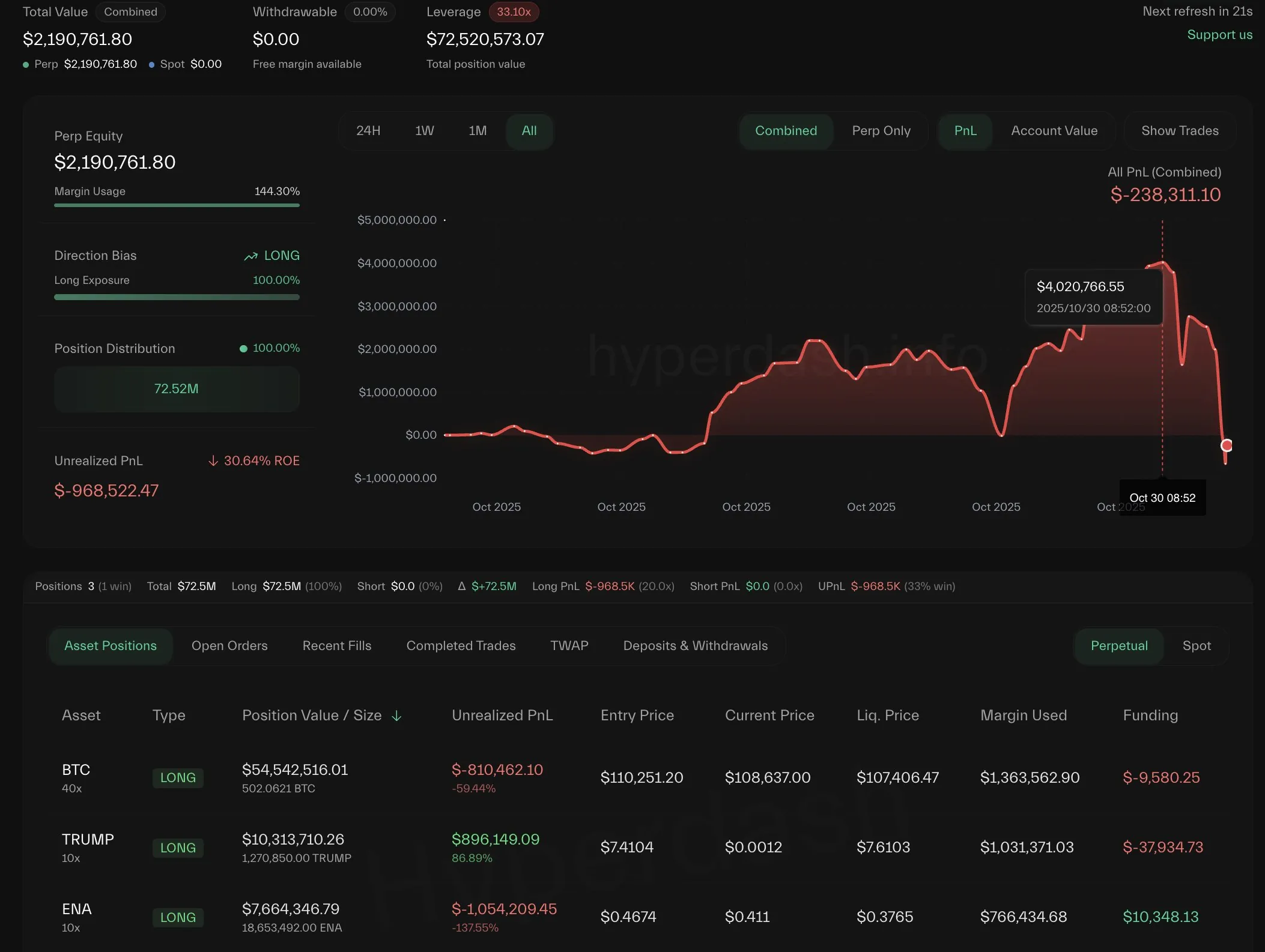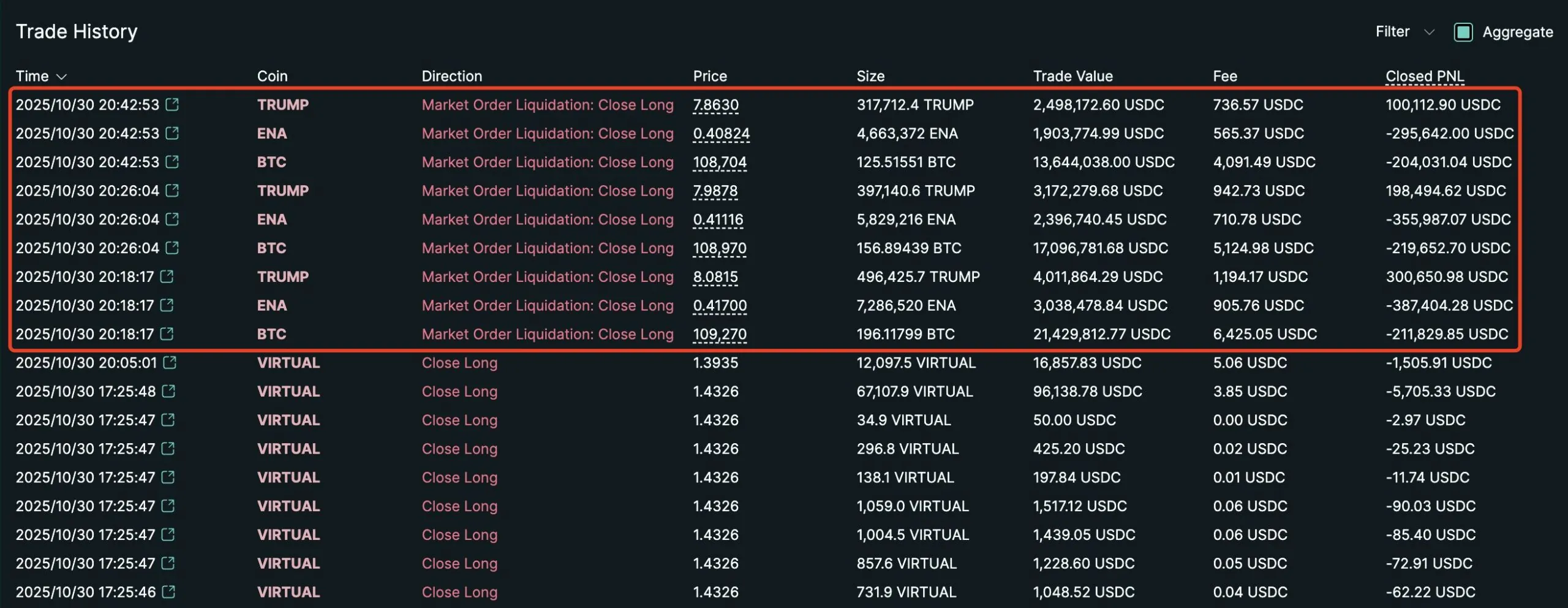 Lookonchain analysts have recorded a series of liquidations on the Hyperliquid decentralized platform, during which one of the traders lost more than $ 4 million in profit in just half an hour. According to experts, he traded highly leveraged futures on bitcoin, the OFFICIAL TRUMP token (TRUMP), and Ethena (ENA). Due to the market’s decline, his positions were liquidated three times in 30 minutes, resulting in a profit of more than $ 4 million and a loss of $ 238,000.