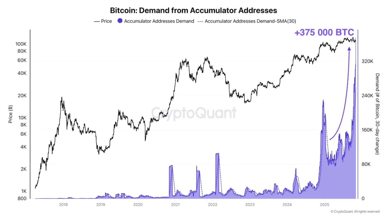 According to the analytical company CryptoQuant, bitcoin-hoarding addresses BTC $101,005.00 Mezo Wrapped BTC -1.19% Market capitalization $52.94 million VOL. 24 hours $3.21 billion have purchased more than 375,000 BTC over the past month, thus updating the historical maximum in terms of purchase volumes. On November 5 alone, investors added more than 50,000 BTC to their holdings.