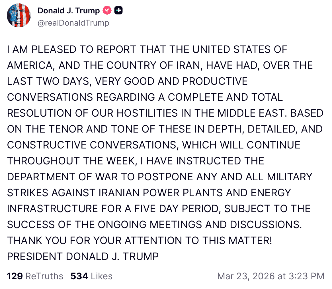 Trump said on Truth Social that Washington and Tehran had «very good and productive talks» and ordered a five-day delay in any military strikes on Iran’s energy infrastructure. This was a key factor in the short-term optimism on the market.