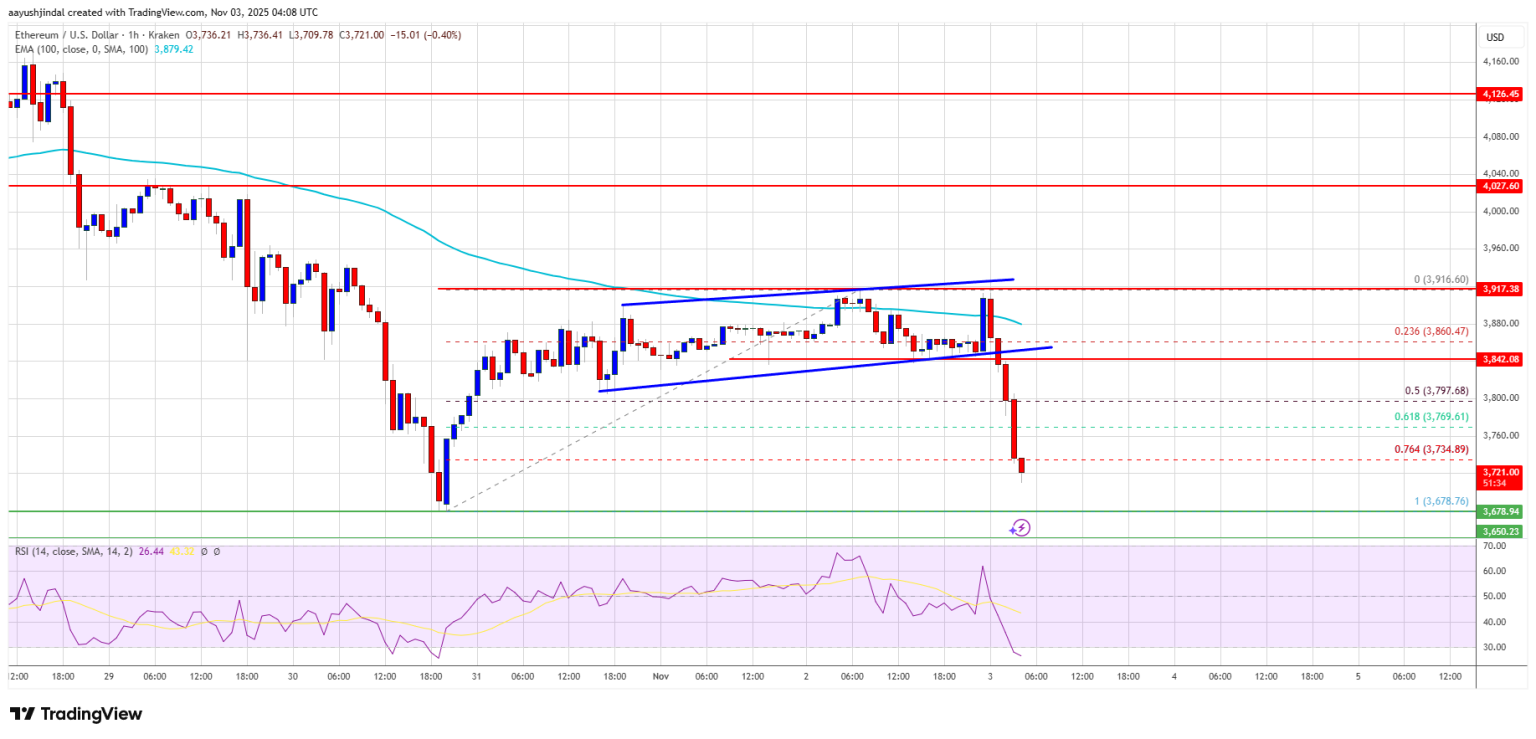 Ethereum ETH $3,714.16 Bridged Ether (StarkGate) -3.39% Market capitalization $85.16 million VOL. 24 hours $2.17 billion is under pressure again after failing to break through the $ 3,920 level. The price of the cryptocurrency dropped below $ 3,850 and $ 3,800, indicating a return of bearish sentiment in the market. ETH is currently trading below its 100-hour simple moving average, and analysts warn that if it falls below $ 3,680, the decline could accelerate.