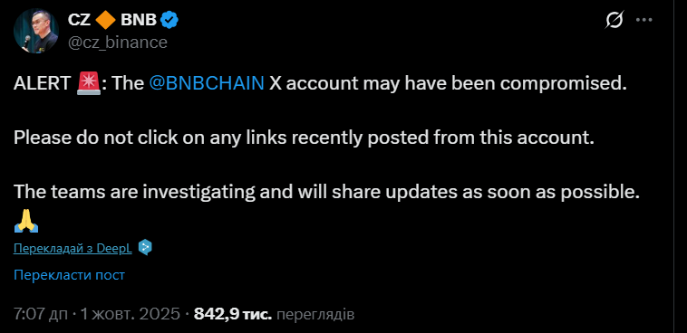 The official Chinese account of BNB Chain on the social network X (formerly Twitter) has been hacked. Former Binance CEO Чанпен Чжао" href="https://noworries.news/biography/chanpen-chzhao/" data-bio-id="3681">Changpeng Zhao (CZ) reported the incident to Binance/status/1 973 238 274 241 208 576«>, urging users not to click on suspicious links.