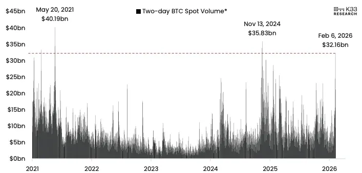 Lunde also described the situation as «hyperactive trading»: as of February 6, the two-day spot volume of bitcoin transactions reached $ 32 billion, one of the highest in history. On February 5 and 6, the figures remained in the 95th percentile, and over the past five years, according to the report, such intensity has only happened once — during the FTX crash; the analyst added that such surges often occur during the passage of local extremes and are usually followed by consolidation and retest of lows.