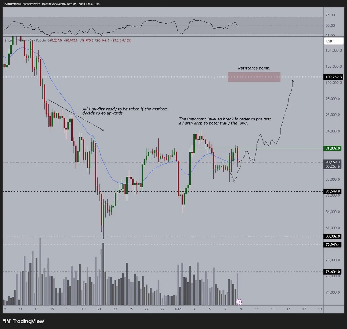 Despite his long-term optimism, the trader expects another decline in the short term. He calls the $ 92,000 level the key for bitcoin: it is the level from which the market has recently rejected it. According to van de Poppe, if Fed Chairman Jerome Powell takes a tougher stance and refrains from further rate cuts, a classic «sell the news» scenario could occur, a short-term collapse that would send BTC to the $ 78,000-$ 82,000 range, after which the market would reverse and begin to recover.