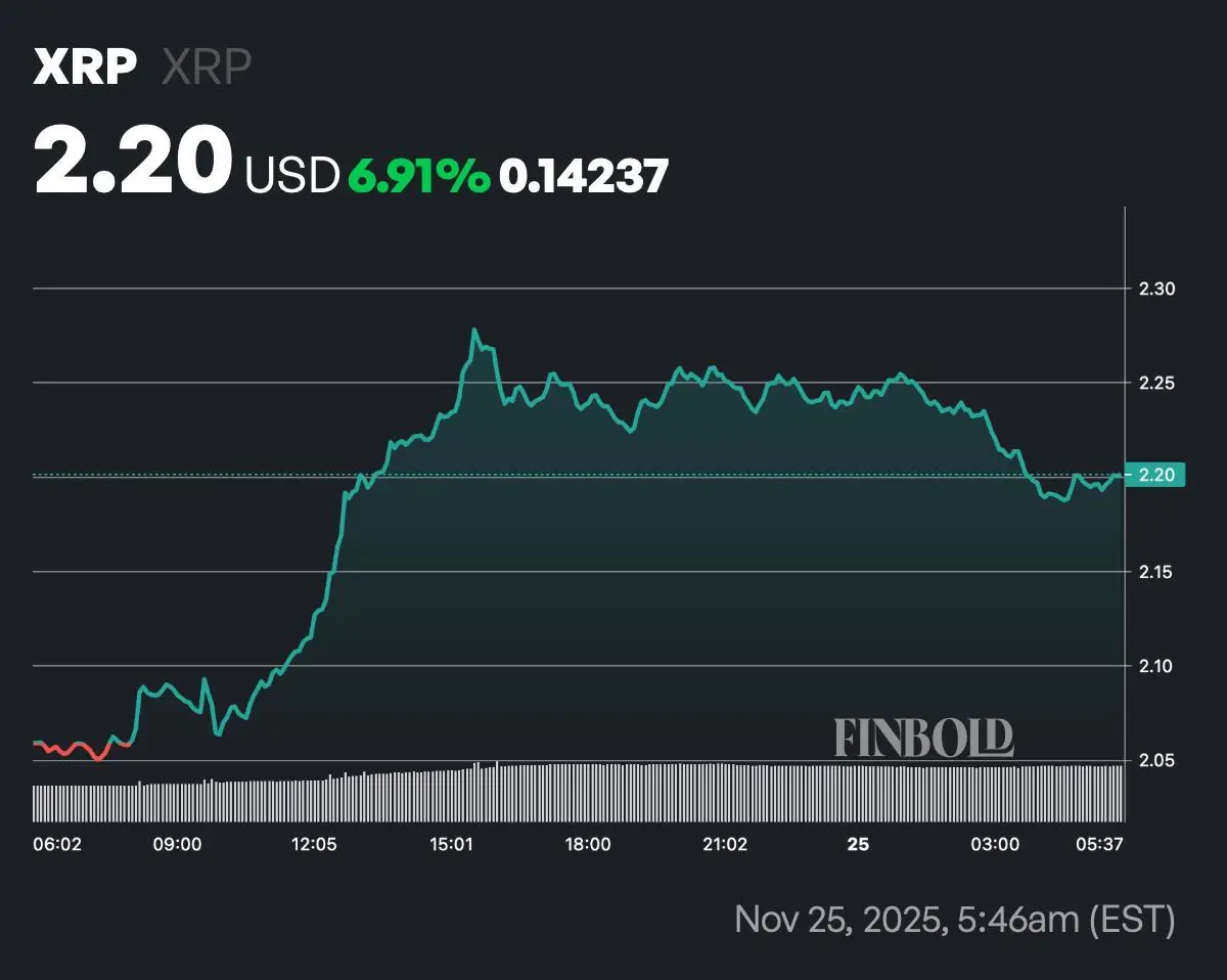 The cryptocurrency XRP XRP $2.19 XRP 0.51% Market capitalization $132.33 billion VOL. 24 hours $0.26 billion has risen sharply in value, adding more than $ 9.5 billion to its market capitalization in just one day. According to Finbold, the figure has risen from $ 123.13 billion on November 24 to $ 132.68 billion as of the current moment. During this time, the XRP price increased by 7.05% and reached $ 2.20, significantly outpacing the average growth of the crypto market, which added only 1.97%. Despite a slight weekly increase of 0.6%, the short-term jump indicates a return of institutional interest in the token.