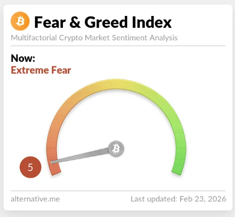 On Monday, February 23, the crypto market’s Fear and Greed Index hit a historic low of just 5 points. Such a value has been recorded only three times since the index began: in August 2019, June 2022, and now, in February 2026.