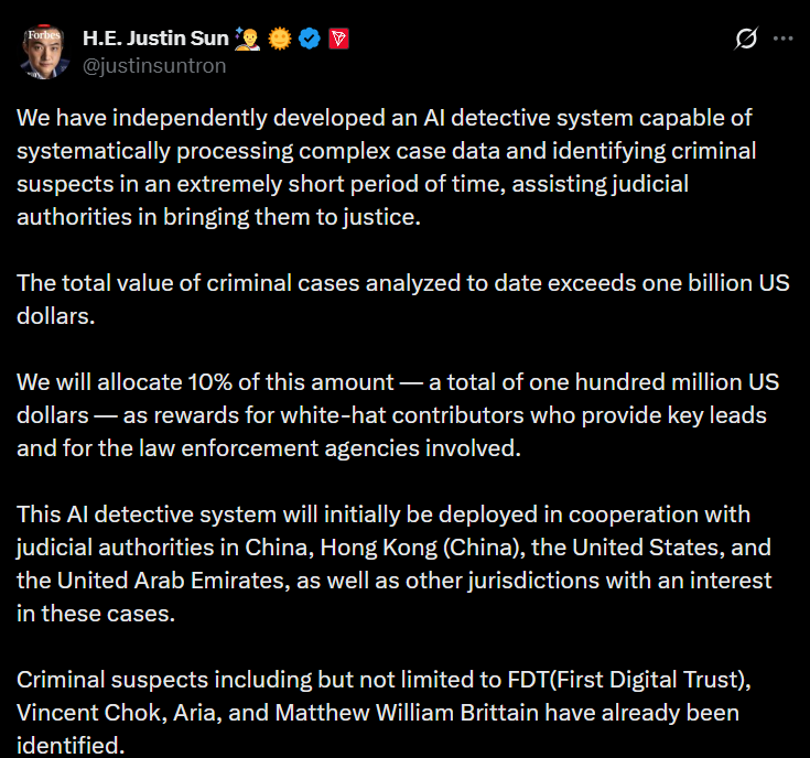 The initiative is being implemented in cooperation with the judicial authorities of China, Hong Kong, the United States, and the United Arab Emirates. It is planned to expand to other countries that show interest. Sun said that the system has already helped identify a number of suspects, including FDT (First Digital Trust), Vincent Chok, Aria, and Matthew William British.