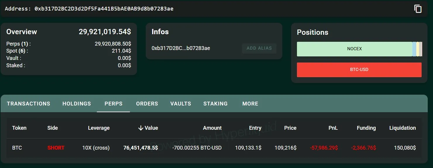 An address associated with a trader transferred $ 30 million in USDC stablecoin to the Hyperliquid platform and opened a short position worth $ 76 million with 10x leverage. The total volume of the transaction is about 700 BTC, opened at $ 109,133 per coin. The position will be liquidated if the price rises to $ 150,080, which indicates a high level of confidence in the forecast of a decline.